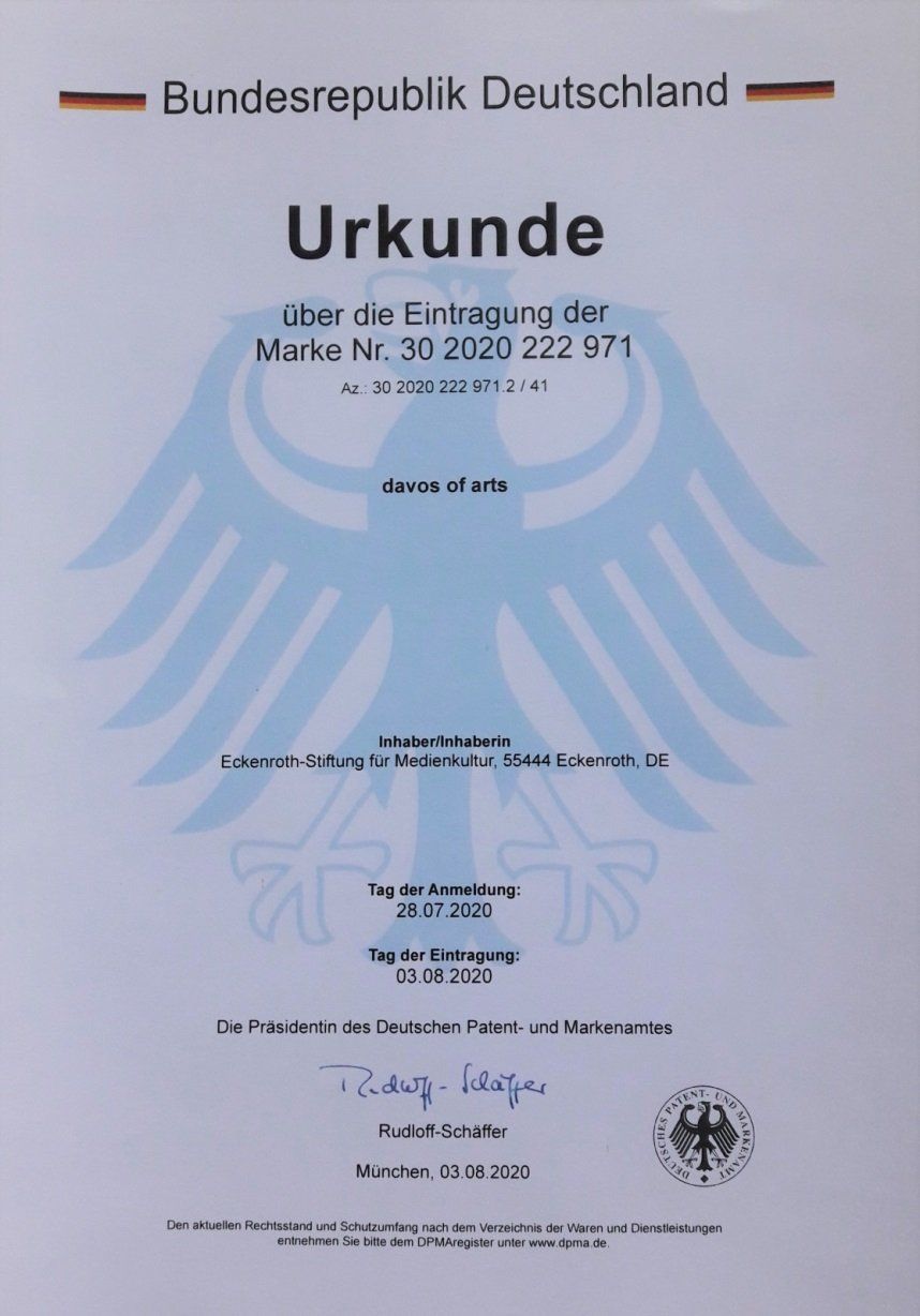 The word mark nr. 30 2020 222 971 expresses, once a year eckenroth.ART, Eckenroth Stiftung für Medienkultur invites international experts in the fields of storytelling, medicine, theatre, philosophy, film, teaching, travel, learning and others, to create a climate of understanding and willingness for change in a modern society and involve young people.